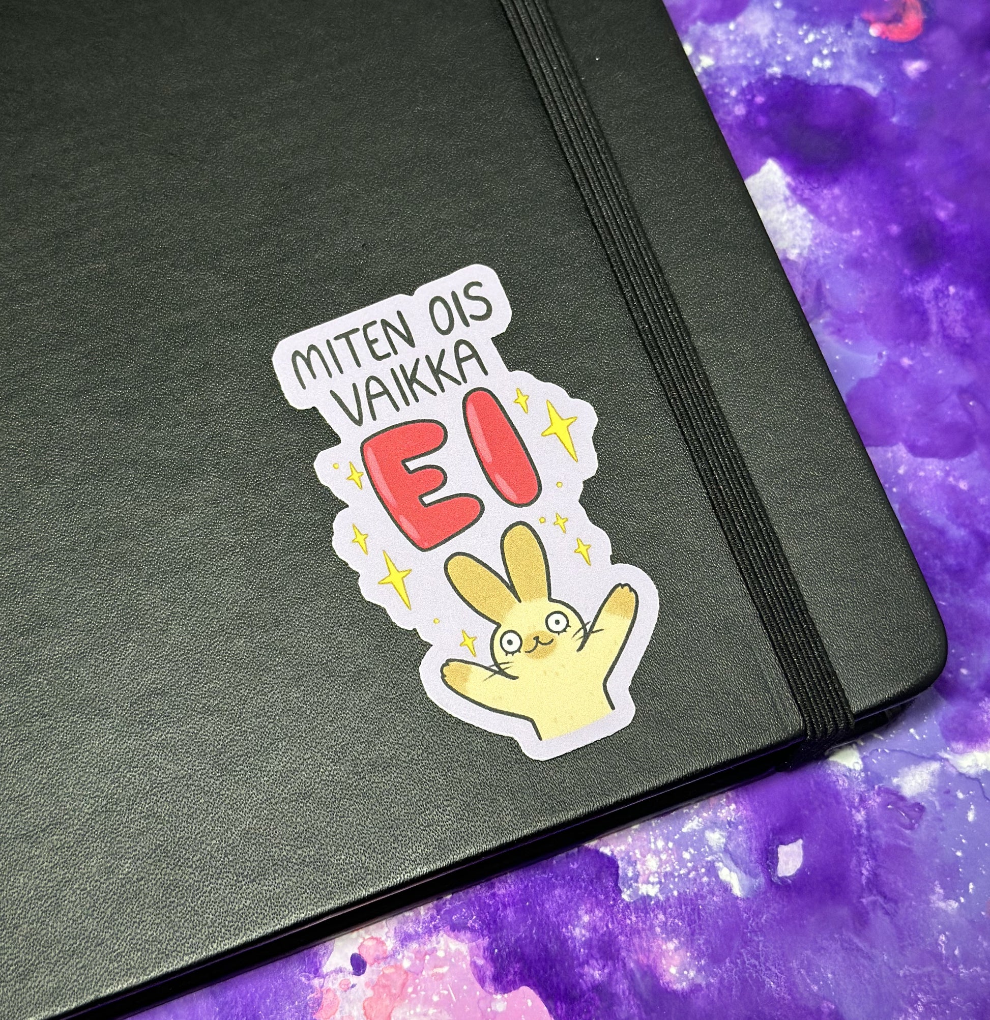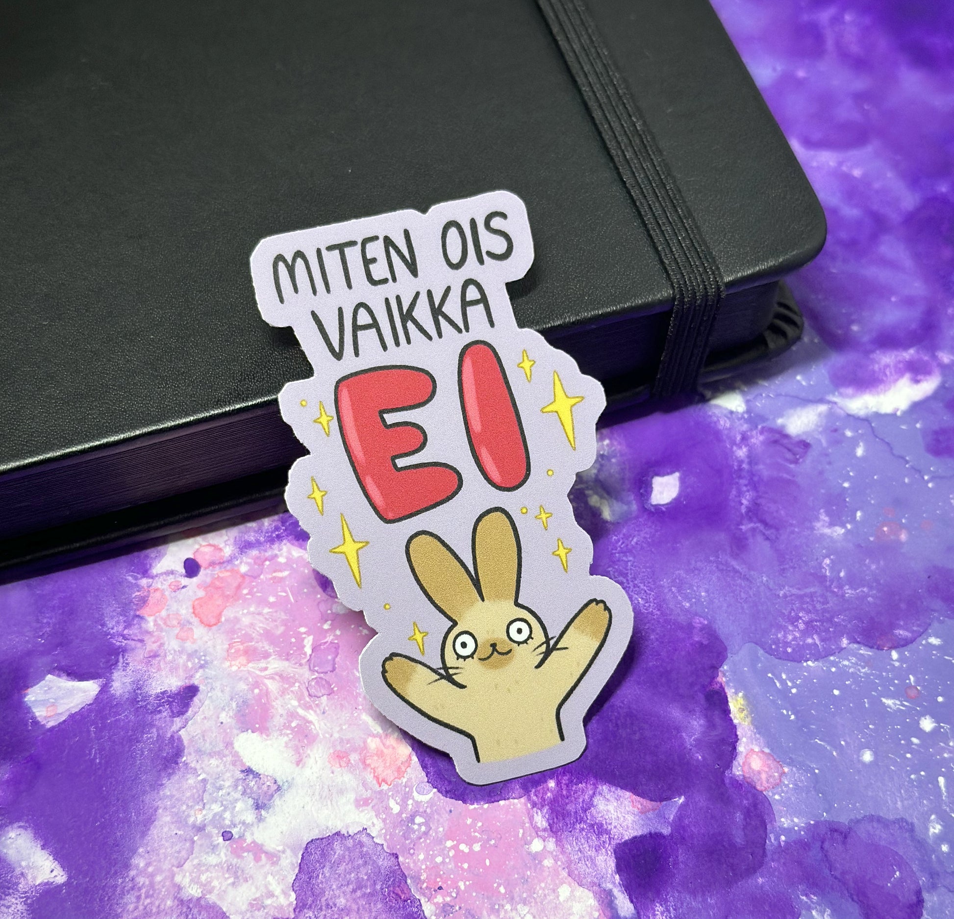 Mattapintainen "Miten ois vaikka ei" pupu -tarra.
