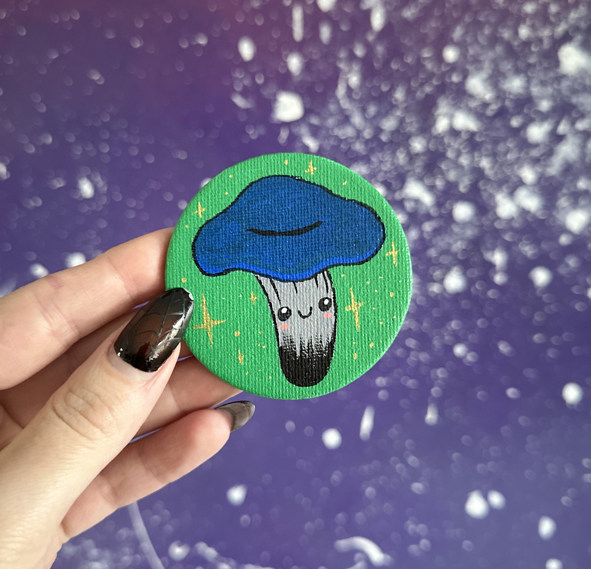 Käsinmaalattu muystatorvisieni magneetti. Tehty maalitusseilla.