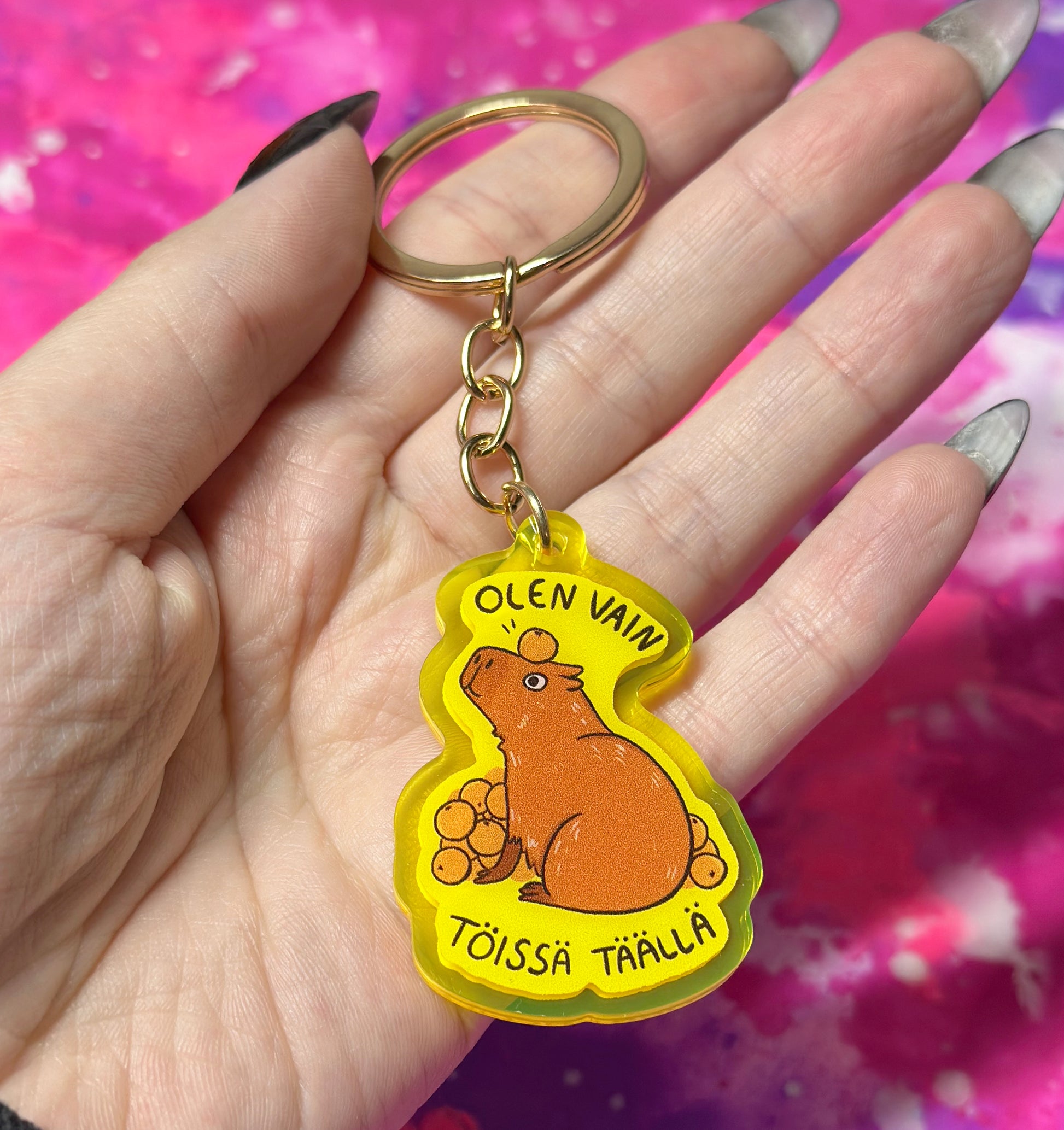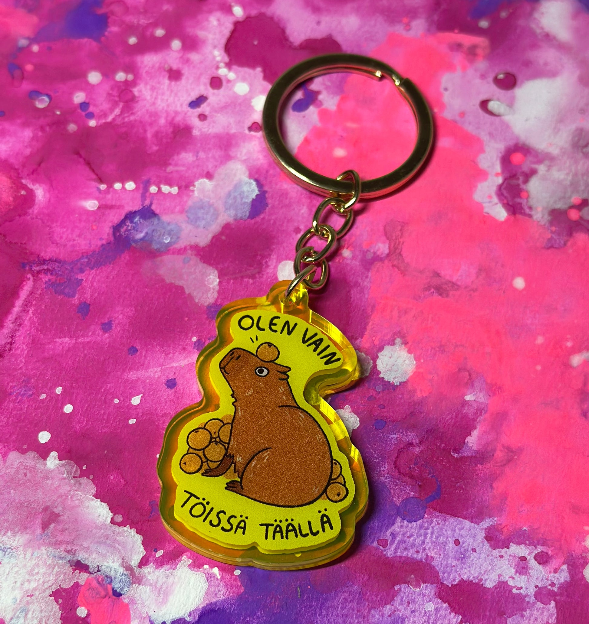 Hauska capybara avaimenperä. Capybara nauttii appelsiinien kanssa leikkimisestä.