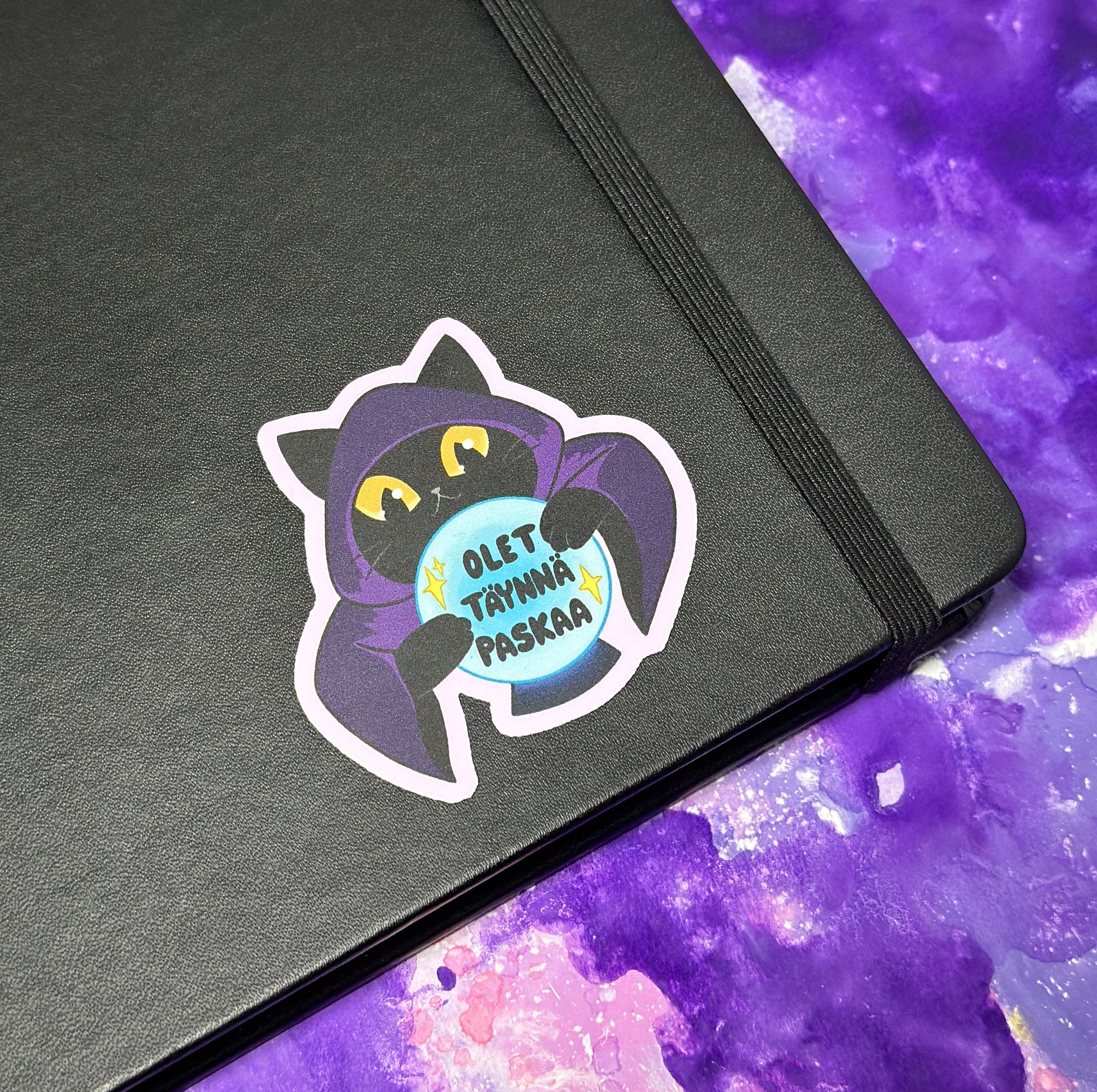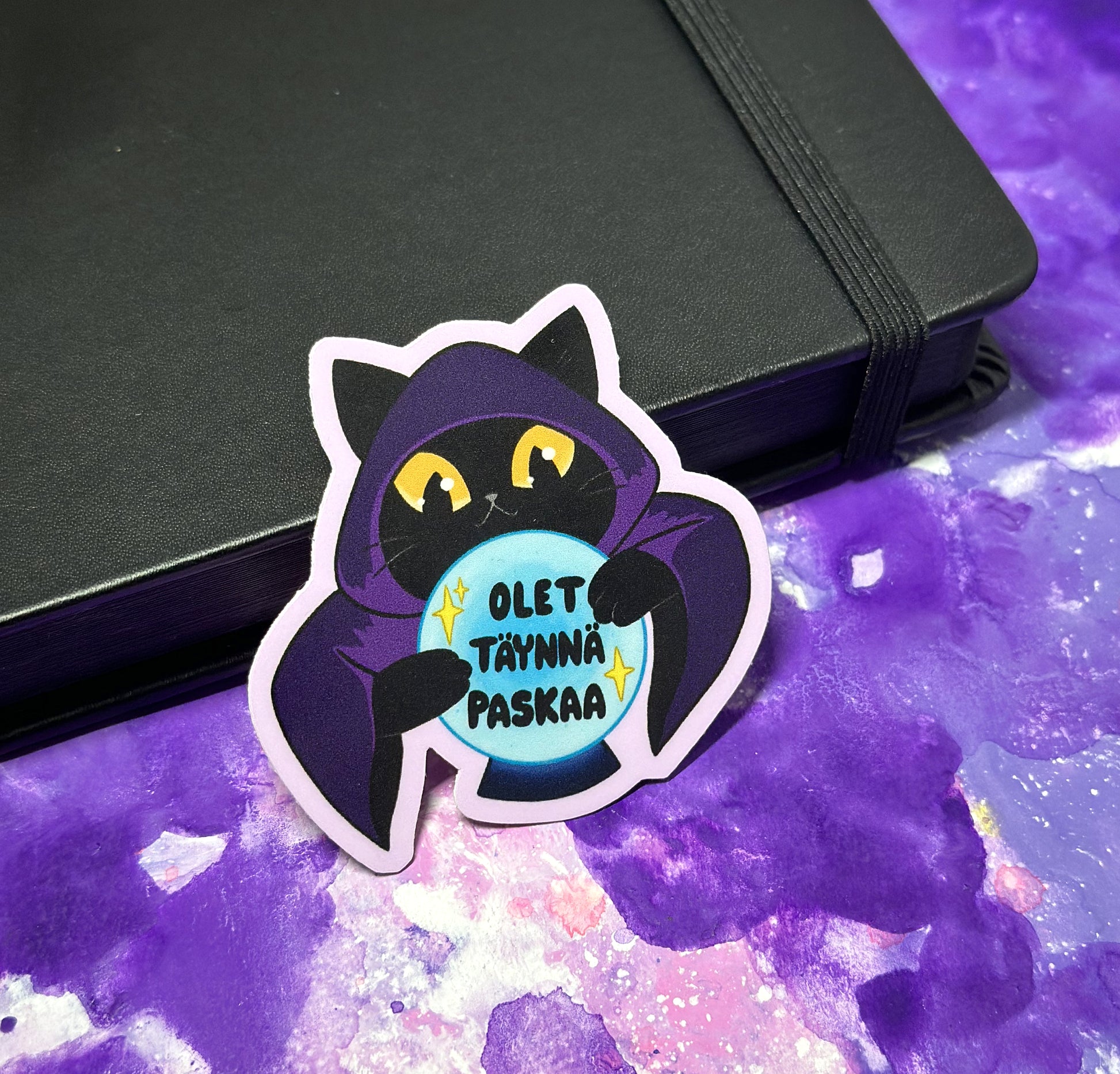 Mattapintainen "Olet täynnä paskaa" ennustaja kissa -tarra.