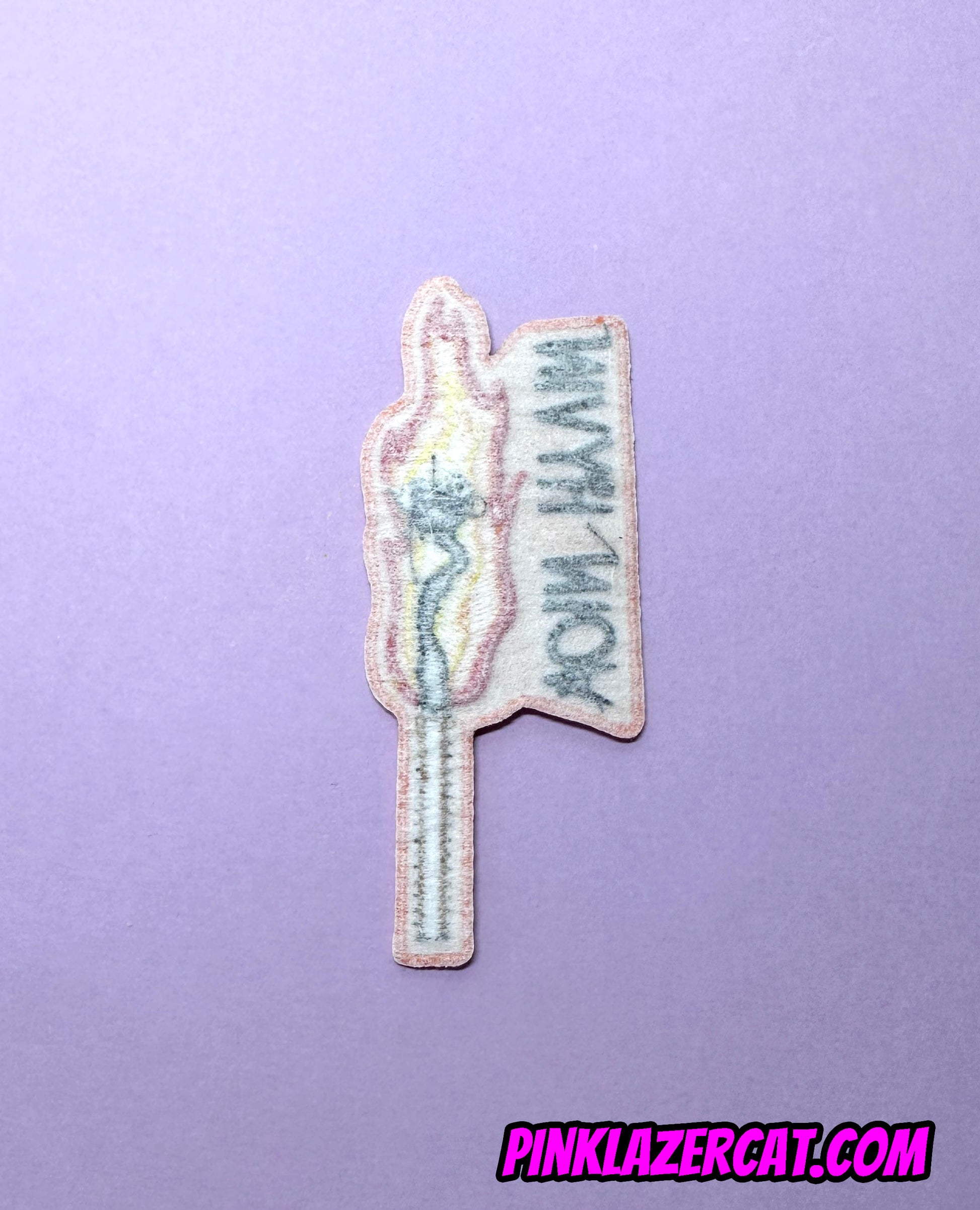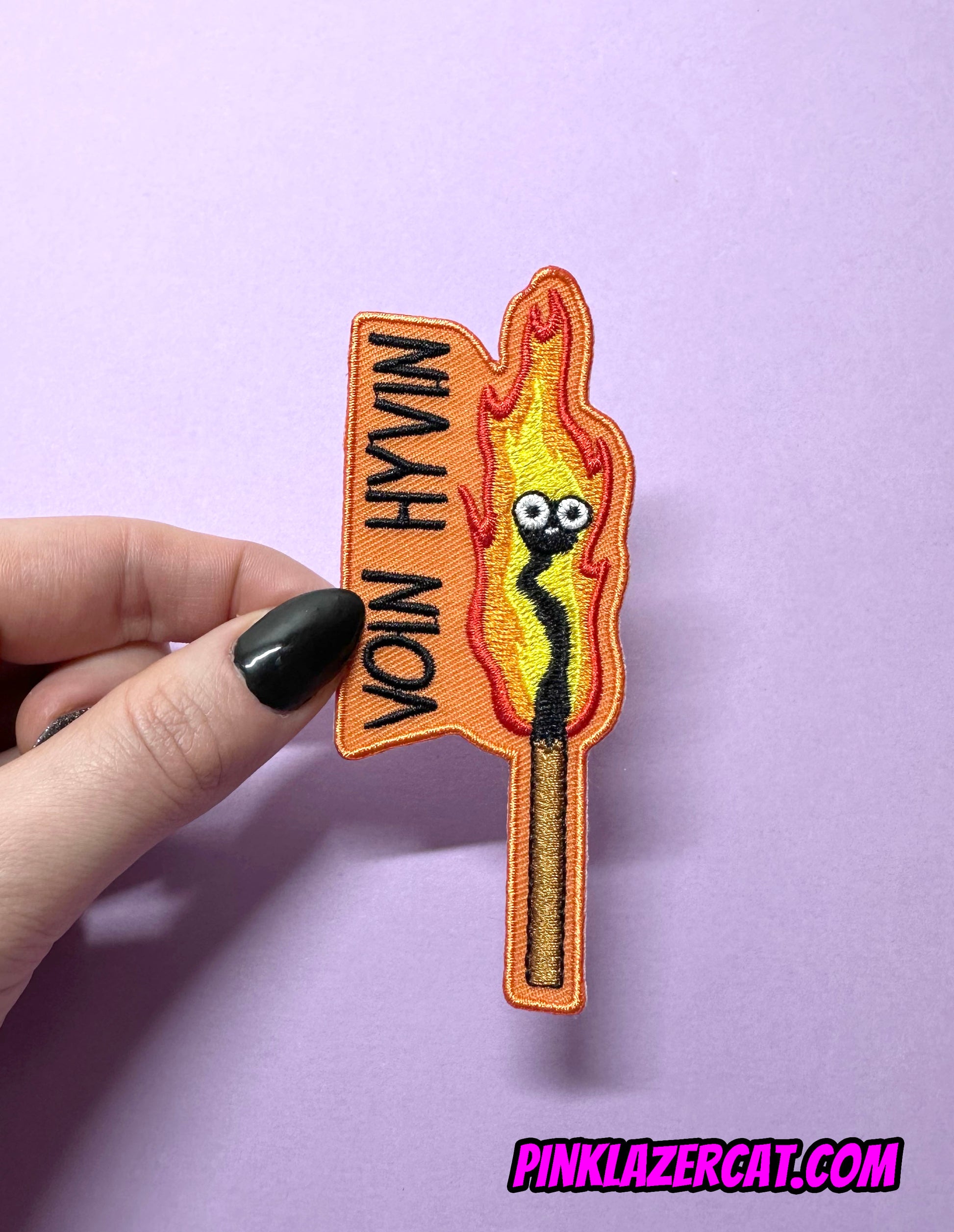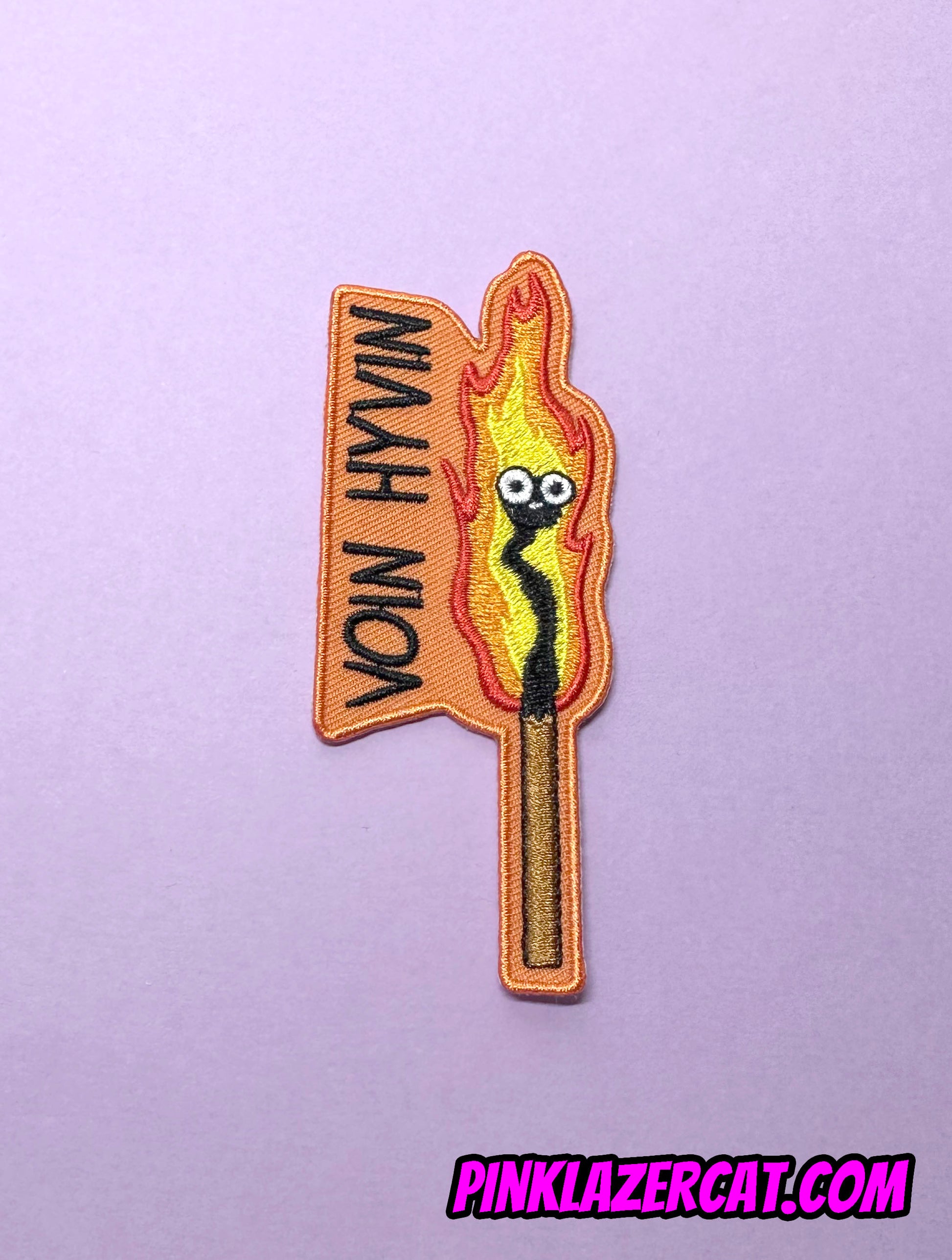 Brodeerattu tulitikku kangasmerkki tekstillä "Voin hyvin"